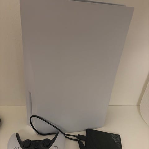 Sony Playstation 5 spelkonsol i vit färg. Stationär konsol med tillhörande trådlös handkontroll (DualSense). Konsolen är avsedd för hemmabruk och stödjer moderna spel och multimediafunktioner. Passar för användare som vill spela Playstation 5-spel och kompatibla Playstation 4-titlar.