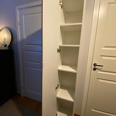IKEA garderobsstomme i vit färg. Mått enligt bild: bredd cirka 60 cm, djup cirka 42 cm och höjd cirka 200cm. Stomme med tre dörrar (med fågelfoton) går att byta eller använda originalskivorna i vitt. Fem hyllplan och en filtlåda för småsaker.