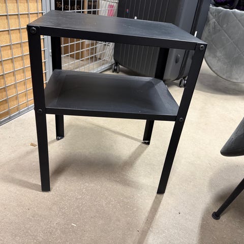 Avlastningsbord i svart metall med två hyllplan. Öppen, rektangulär stomme i metall med ett hyllplan i mitten och ett överst. Passar som förvaringsmöbel i exempelvis vardagsrum, hall eller kontor för böcker, dekoration eller annan förvaring.