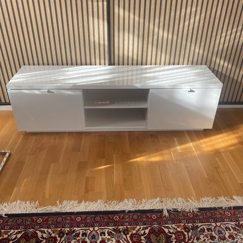 IKEA tv-bänk med två utdragbara lådor i brun träfinish. Öppen förvaring upptill med två fack och lådförvaring nedtill. Bänken står på ben i metallfärg. Passar som tv-möbel eller förvaringsmöbel i vardagsrum eller sovrum. Mått och exakt modellnamn är okända.