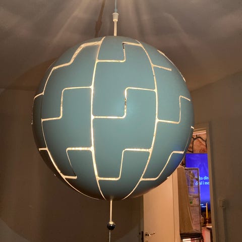 Taklampa i Ikeas PS 2014-serie, målad som Dödsstjärnan. Utfällbar; när man drar i snöret ”exploderar” Dödsstjärnan. Fint skick.