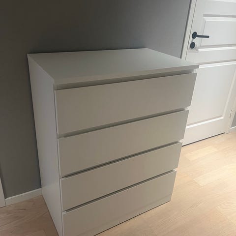Gråvit byrå med fyra lådor. Stabil och rymlig, bra skick.