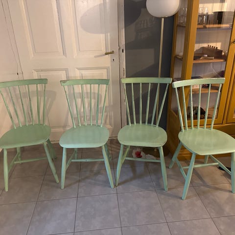 3st stadiga pinnstolar i trä. Stolarna är äldre och använda. Behöver kanske lite ny färg och lite omtanke annars fungerar dom bra.