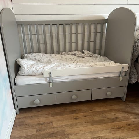 IKEA juniorsäng/spjälsäng ”Gonatt” i grå färg. Under sängen finns inbyggd förvaring i form av tre lådor med runda knoppar. Måtten är 60X120 cm.