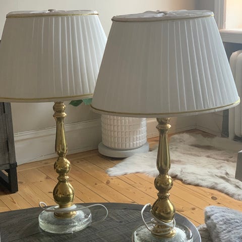 BILD 1: Vintage bordslampor 2 st - munblåst vitt opalglas / mjölkglas - original 50-tal 60-tal 70-tal i välbevarat skick. Vita lampskärmar med struktur ger ett varmt och mysigt sken. I nyskick! Paret är fint med både modern och retro inredning - space age funkis industri mm - på en byrå sideboard bokhylla sängbord alt som fönsterlampor - nätt storlek. Fungerande originalel på den ena, nydragen el på den andra. Mått totalhöjd inkl skärm: 31 cm. Skärm H: 16,5 cm. Största diam: 16 cm. Lampfot H: 22,5 cm inkl lamphållare. Pris: 300 kr per lampa. Säljs tillsammans som par. Titta gärna på mina andra annonser!