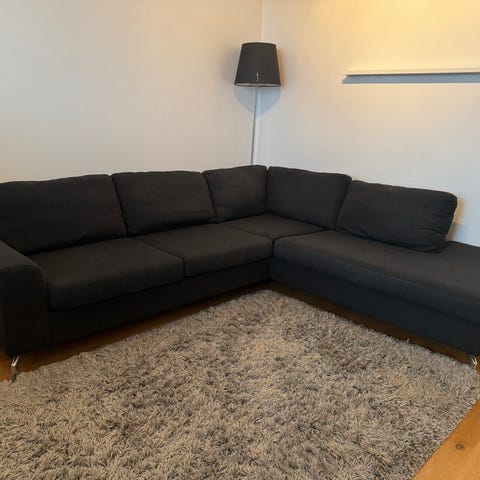 Mörkgrå L-formad hörnsoffa i bra skick.