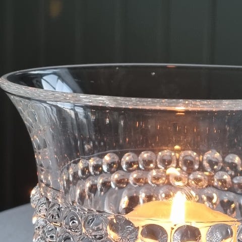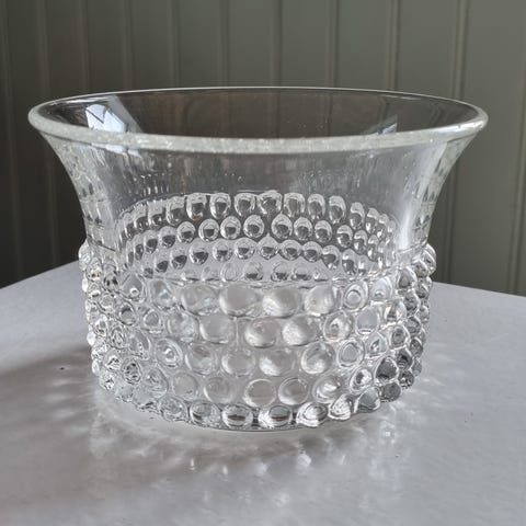 Säljer en transparent glaskruka med två små handtag på sidorna. Krukan har ett unikt, strukturerat mönster som ger ett coolt ljusspel och en dekorativ känsla. Perfekt som inredningsdetalj eller för förvaring av småsaker.