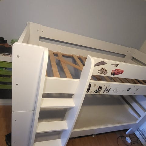 Våningssäng med plats för förvaring under. Madrass medföljer ej, men får plats en 90 madrass.