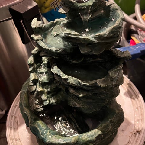 Dekorativ vattenfontän i grön stenimitation med flera nivåer där vattnet kan rinna mellan skålarna. Fontänen är utformad för inomhusbruk eller skyddad utomhusmiljö, exempelvis på altan eller balkong. Passar som inredningsdetalj i vardagsrum, hall eller kontor och kan placeras på bord, hylla eller annan plan yta. Fontänen har naturinspirerad design med strukturer som liknar klippor och stenformationer.