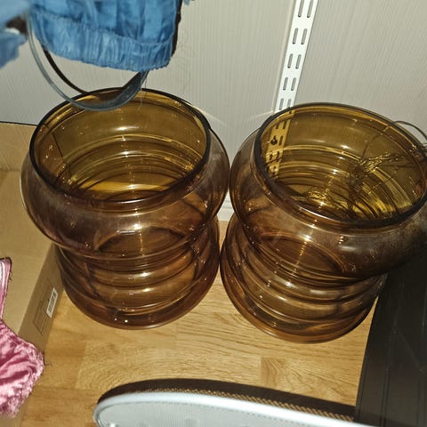Säljer en genomskinlig glasburk med dekorativt mönster och ett robust metallhandtag. Burken har en rund öppning och är perfekt för förvaring eller dekoration. Metallringen upptill ger en snygg kontrast till glaset.