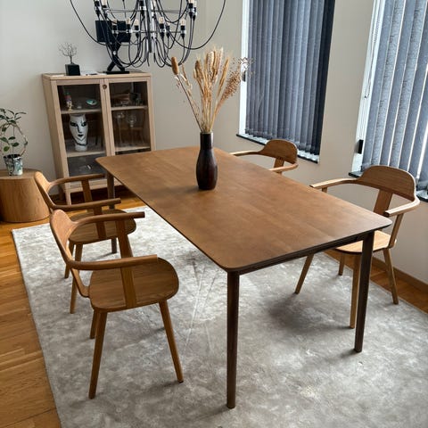 Matbord Plaine i ek från Mio 140x85x74 cm. 4 stolar från Rowico i ek och vit konstskinn. Lite sprickor i skinnet på stolarna annars fint skick. Hämtas i Landskrona.