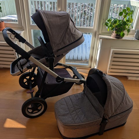 Vi säljer vår Thule Chariot Sport 2 Double i Midnight Black med extraköpt skydd med extra tillbehör (se nedan). Säljer då äldsta dottern börjar växa ur den.