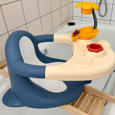 Stokke Flexi Bath badbalja i vitt med turkosa detaljer. Den lilla varianten. Propp med värmeindikator. Sparsamt använt. Medföljer ett liggstöd för bebis från annan tillverkare.