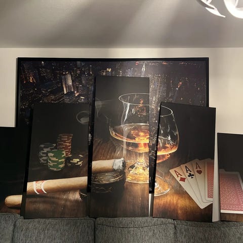 Tavla med motiv av ett glas konjak, cigarr och spelkort på bord. Tavlan är i storlek 150×50 cm, har en snygg svart träram, den är inplastad och är i nyskick.