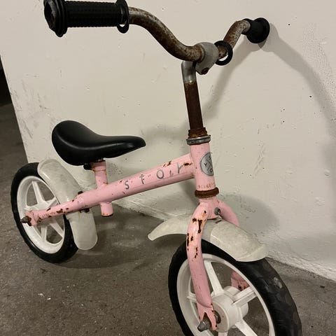 Stoy balanscykel med 10" hjul. I använt men fint brukbart skick. Skavanker förekommer, se bilder. Är annonsen kvar finns cykeln kvar.