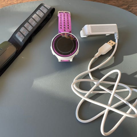 Garmin Forerunner 235 pulsklocka i svart med perforerat silikonarmband. Klockan har rund urtavla och optisk pulsmätare på undersidan. På baksidan finns laddningskontakt och sensorer. Med klockan följer en USB-laddkabel med klämfäste för anslutning till klockan. Lämplig för löpning och annan träning där pulsmätning och aktivitetsregistrering önskas.