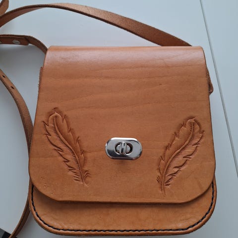 Väskan är i blått läder med en axelrem som är 115 cm lång och 2 cm bred.