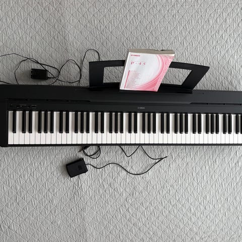 Medföljer gör ett notställ, en strömadapter, hörlurar och en pianopall.