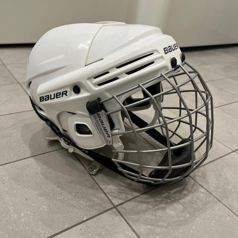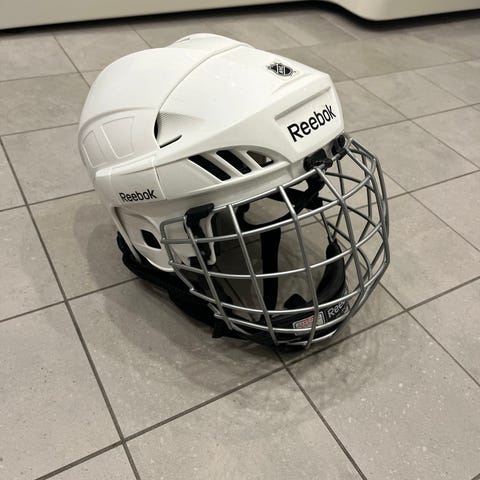 Reebok ishockeyhjälm med avtagbart galler i metall. Hjälmen är röd med svart galler och har ventilationshål upptill och på sidorna. Justerbara remmar under hakan för att hålla hjälmen på plats. Passar för ishockey och annan isträning där huvud- och ansiktsskydd behövs.