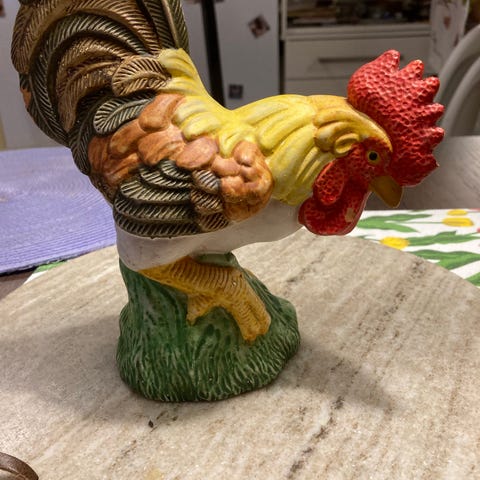 Retro keramikfigur med tupp och två kycklingar, troligen från 1950- eller 1960-talet. Fin som dekoration i retro eller lantlig stil.
