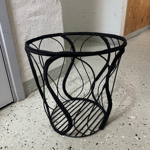 Flätad korg tillverkad i svart rotting med två handtag. Korgen har en rund form och ett öppet mönster, lämplig för förvaring eller dekoration.