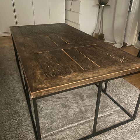 Vardagsrumsbord i oljad björk med ett underrede i smide som sträcker sig som ett galler under hela bordet.