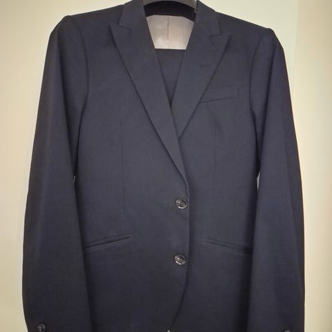 Det är en Tux som är mörkblå med svarta detaljer. Det finns även på byxorna en svart rand som går ner för benet.