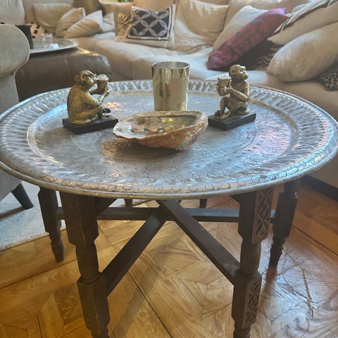 SALONGBORD - brickbord - soffbord i trä med brun finish. Bordsskivan består av fyra uppfällbara brickdelar med handtag och metallbeslag. Mått ca 149 x 99 cm och höjd ca 53 cm.