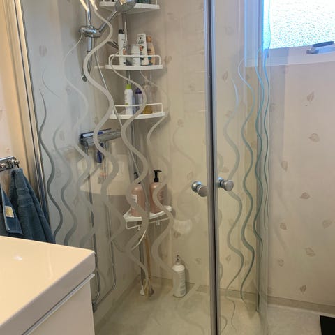 Hörnduschkabin med glasdörrar och aluminiumprofiler. Kabinen har flera hyllplan för förvaring av duschprodukter och är avsedd att placeras i hörn.