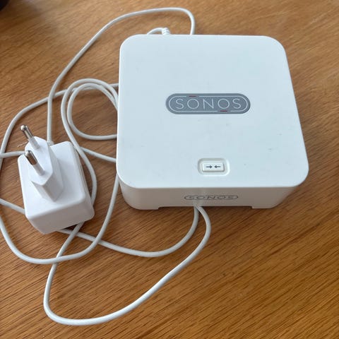 Sonos Bridge nätverksadapter i vit färg. Enheten används för att ansluta Sonos-systemet till hemnätverket via kabel och skapa ett trådlöst Sonos-nätverk för kompatibla Sonos-högtalare och komponenter. Strömadapter medföljer enligt bild.