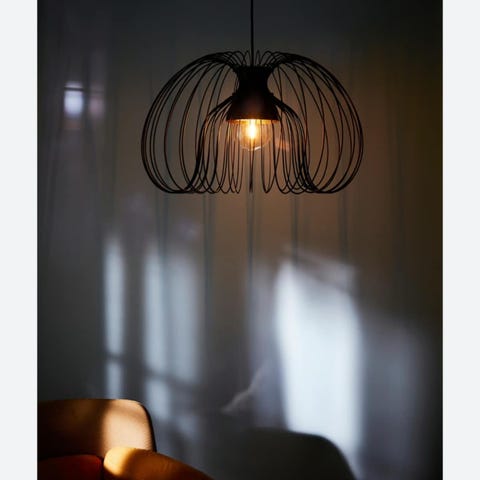 IKEA KALLFRONT / HEMMA taklampa i svart metall med en diameter på 52 cm. Lampan har en skärm uppbyggd av tunna metallstänger som ger ett luftigt uttryck och sprider ljuset runtom. Passar som allmänbelysning i exempelvis vardagsrum, sovrum eller kök. Ansluts i tak och används med standard ljuskälla med sockel som passar till modellen (ingår normalt inte).