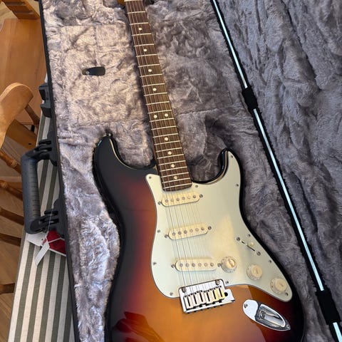 Fender Stratocaster elgitarr i blå finish. Klassisk Stratocaster‑kropp med tre singlecoil‑mikrofoner, volym- och tonkontroller samt 5‑lägesomkopplare. Gitarren har skruvad hals med greppbräda i trä och standard Fender‑stall med tremolo. Passar för elgitarrspel inom flera musikstilar.
