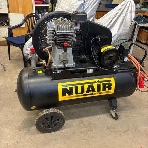 Nuair LL 100 HP3 kompressor med 100 liters trycktank. Utrustad med B2800-pump och 400V elmotor. Ljudnivå märkt till 96 dB. Avsedd för tryckluftsarbete i verkstad eller garage där trefasanslutning finns tillgänglig.