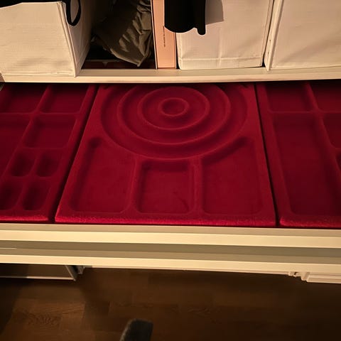 Ikea komplement smyckesförvaring, slutsålda. 3 st inläggslådor á 25x58cm. Vackert röda och i mkt fint skick.
