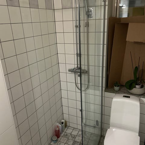 Duschhörna i klarglas med raka aluminiumprofiler. Dörr med vertikalt handtag i kromad metall. Passar för hörnmontage i badrum där man önskar en duschlösning med glasvägg och dörr. Fint skick.