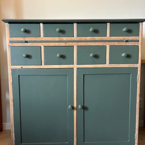 Säljer en mycket fin och välbevarad skänk i klassisk stil. Målad i en lugn grön ton som ger ett mjukt och stilrent intryck. Skänken har tre dörrar och två lådor med dekorativa mässingshandtag som ger en elegant känsla.