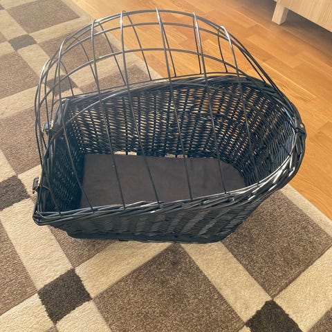 Jollypaw cykelkorg för hund i svart flätat material med metallgaller upptill. Korgen är avsedd att monteras på cykel och har remmar och fästen för att säkra korgen och locket. Passar mindre hundar eller andra smådjur som ska transporteras på cykel. Korgen har hög kant och galler som hjälper till att hålla djuret på plats under färd.