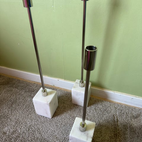 Helt nya. Har i princip bara monterats. På en av mellan ljusstakarna finns det några märken från när de har legat mot varandra men inget man direkt tänker på eller ser direkt.