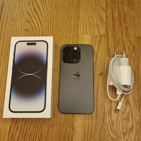 Apple iPhone 14 Pro Max mobiltelefon med 256 GB internminne. Modellen har stor skärm med skärmhål för frontkamera och Face ID, samt trippelkamera på baksidan med blixt. Levereras med förpackning samt USB till Lightning‑kabel enligt bilder. Lämplig för användning till vardag, arbete, foto, video och appar.