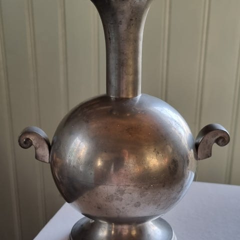 Miniatyr i mässing. 100 mm hög. Fot i 30 mm i diameter. Etsat svagt mönster