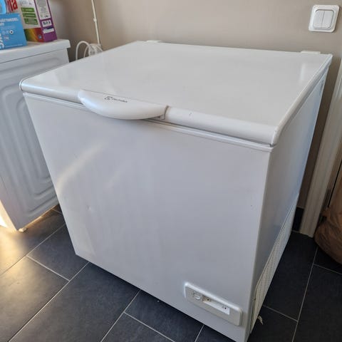 Modellen är en fristående frysbox med lock upptill och manuell temperaturreglering på frontpanelen.