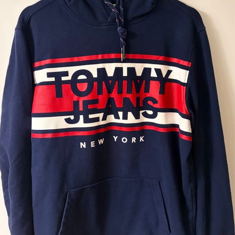 Tommy Hilfiger huvtröja för herr i storlek L. Tröjan är blå och tillverkad i bomull. Modellen har huva med dragsko och en stor känguruficka framtill. Långärmad med ribbade muddar i ärmslut och nederkant. Passar som vardagströja eller som extra lager vid svalare väder.