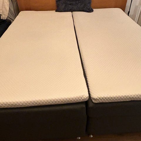 Tempur ställbar säng med två separata madrasser i grått tyg. Båda sängbottnarna är ställbara med hjälp av fjärrkontroll, vilket gör det möjligt att justera huvud- och fotända efter behov. Madrasserna är Tempur med tryckavlastande material. Sängen står på ben i metall och har en träram av ek. Dubbelsäng med två individuellt justerbara liggytor.
