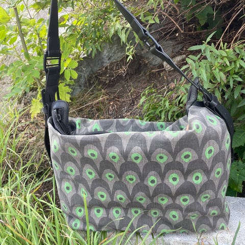 Snygg och praktisk skötväska i bomullsväv. Väskan kan hängas på barnvagnen med hjälp av straps. Det finns flera bra fack för bl.a. telefon, vattenflaska m.m. Äkta skinndetaljer på handtag, detaljer och botten.