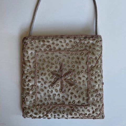 Elegant aftonväska med pärlor, 15 x 13 cm, med lång snodd för axelbruk