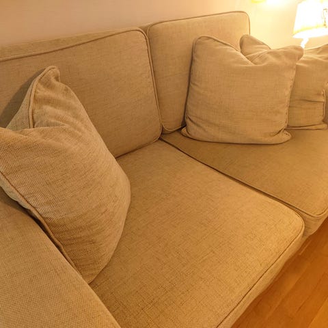 Mio soffa i beige tyg. 4st prydnadskuddar i samma tyg. Rak modell med armstöd på båda sidor. Passar till vardagsrum eller tv-rum som sittplats för flera personer. Har även en kortare soffa till salu av samma modell, lite kortare 190 cm bredd. Finns också på Blocket.