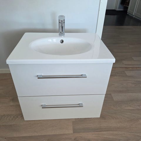 Badrumskommod med integrerat tvättställ i vit färg. Kommoden har två utdragslådor med invändig indelning för förvaring. Tvättstället är infällt i bänkskivan och har ett engreppsblandare monterad. Lådorna är försedda med belysning på insidan. Passar som förvarings- och tvättlösning i badrum eller toalett.