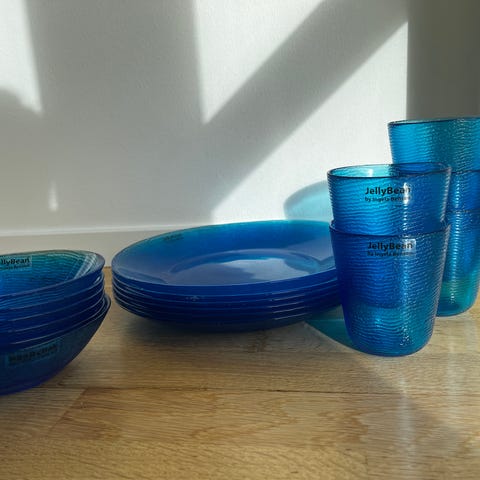 Nu säljer jag en komplett och mycket vacker uppsättning ur serien “Gästa med Gösta”, formgiven av Gösta Sigvard för Lindshammars glasbruk under 1960–70-talet.