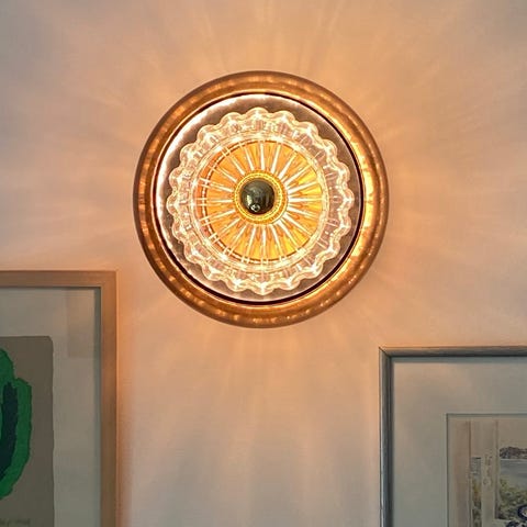 Vägglampa i rotting. Uppdelad i två nivåer där glödlampan sitter mellan de olika ringarnas nivåer. Ger ett behagligt och mysigt sken.