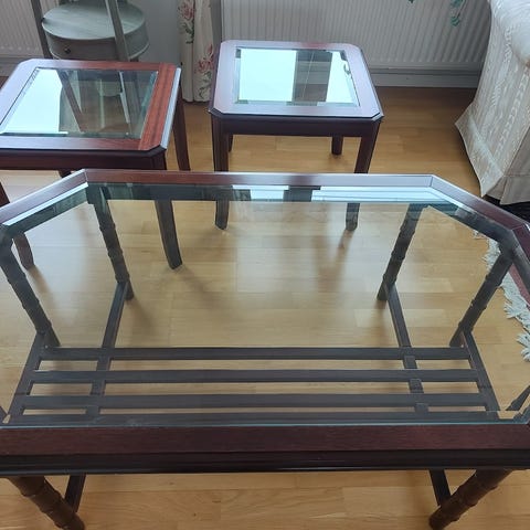 Säljer två sidobord i fint skick. Glaset sitter inte fast utan ligger på som en glasskiva.
